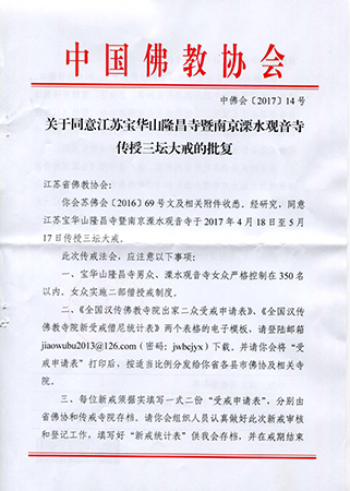 为绍隆佛种,续佛慧命,秉承世尊遗教,弘扬隆昌寺传戒正范,光大如来戒法。经中国佛教协会(中佛会[2017]14号)批准,由江苏省佛教协会主办,宝华山隆昌寺及观音寺承办传授三坛大戒法会。通知如下: