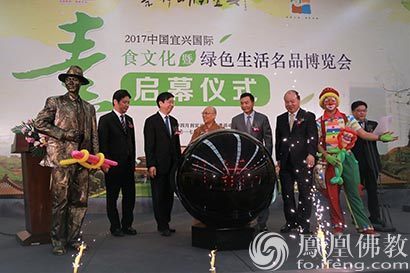 2017中国宜兴国际素食文化暨绿色生活名品博览会,4月27日由国际佛光会世界总会署理事长慈容法师、江苏省旅游局副局长经圣贤先生、中共宜兴市委书记沈建先生、宜兴市人大常委会主任刘亚民先生、中共宜兴市委副书记、统战部长周中平先生共同启动水晶球后正式揭开序幕,现场贵宾云集,还有星云文化教育公益基金会理事长妙士法师、秘书长张静之女士、灵山慈善基金会项目总监刘艳峰先生、台湾人间福报社长金蜀卿女士以及宜兴市领导、相关部门,客商代表、展商代表以及新闻界的朋友,近500人出席。