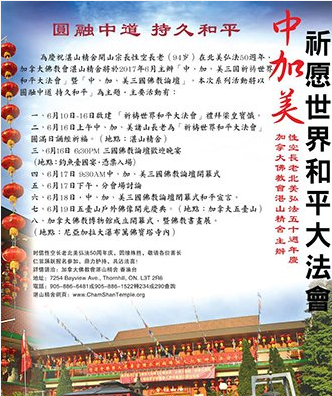 为庆祝湛山精舍开山宗长性空长老(94岁)在北美弘法50周年,加拿大佛教会湛山精舍将于2017年6月10日至20日主办“加、中、美三国祈祷世界和平大法会”暨“加、中、美三国佛教论坛”。