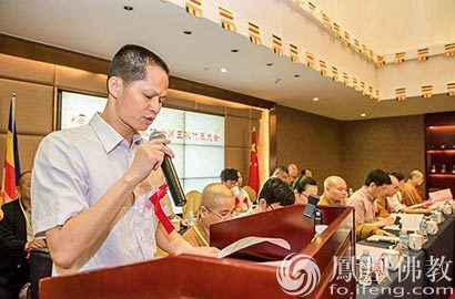 永春县民族与宗教事务局局长林其锵先生,宣读佛教协会新一届领导班子及致辞(图片来源:凤凰佛教)