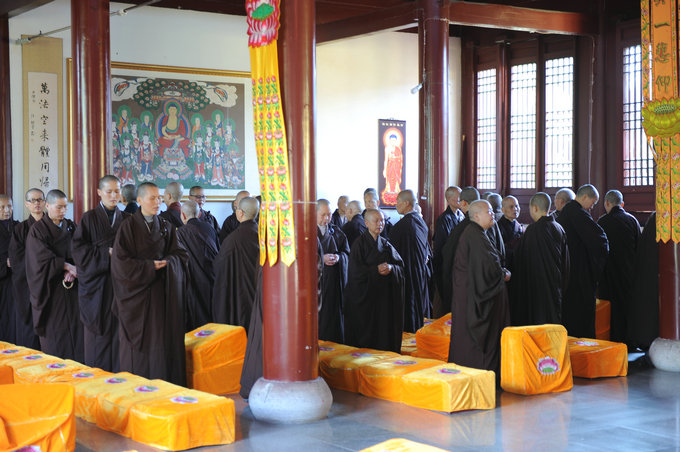 虽然称为“常规板块”,但监香德范法师认为,精进不精进是相对的,这次的“常规板块”其实和过去“五一”“十一”的精进佛七是一样的,每天念佛也在14 个小时以上。只是这次的“精进板块”相较以往佛七,念佛时间更长一点,更精进了一些。他介绍大雄宝殿堂口念佛情况说,起初大众心绪还比较躁妄,念佛音声不和谐,七零八落的;两三天后,渐渐就“异口同音”了,大众念佛的摄受力很强,真如“海潮音”一般,此时如果进到佛堂,躁妄的身心瞬间就能融入到那种“哀亮、深沉”的感觉里面,非常赞叹大家。