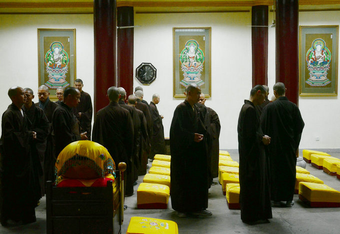 东林寺方丈大安法师在老念佛堂精进念佛