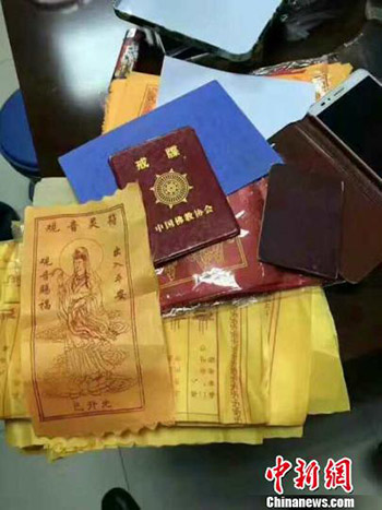 图为假冒僧人掉包用的消灾布符。(图片来源:中国新闻网 摄影:冯忠海)