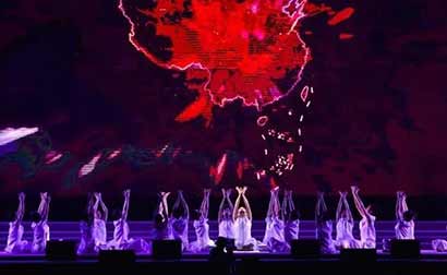 京艺术学院舞蹈学院的舞者在舞台上围成一个圆,随着梵、藏、日、韩、不丹、西班牙、中文七种语言的《心经》版本,变换展现不同地区的肢体舞蹈,主幕也现出各区地图,象征没有语言藩篱的“世界一心”。