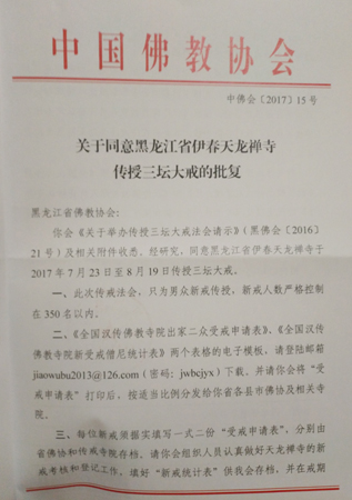 为绍隆佛种,续佛慧命,秉承世尊遗教,光大如来戒法,经中国佛教协会(中佛会【2017】15号)批复,同意黑龙江省伊春市天龙禅寺于2017年7月23日(农历润六月初一)至8月19日(农历润六月二十八)传授三坛大戒。戒期将严格按照《国家宗教事务条例》以及《全国汉传佛教寺院传授三坛大戒管理办法》的规定执行。