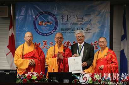 中加美三国佛教论坛凝聚了三国佛教界的共同愿望,形成了《多伦多宣言》,中国佛教协会副会长湛如大法师用中文宣读《多伦多宣言》,美国洛杉矶佛教联盟照初大和尚用英文宣读《多伦多宣言》。宣言真诚呼吁:中、加、美三国佛教徒秉持中道圆融的智慧,继承先贤的弘法誓愿,凝聚向上向善的力量,弘扬慈悲喜舍的精神,促进不同文明的交流互鉴,推进世界各国的平等合作,为世界永久和平而共同努力。