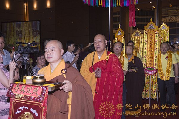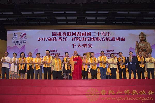 2017年8月26日晚19时,由香港福建同乡会、普陀山风景名胜区管理委员会和普陀山佛教协会共同举办的“庆祝香港回归二十周年2017福佑香江·普陀山南海观音庇护祈福千人斋宴”在香港会议展览中心隆重举行。香港福建同乡会会长陈聪聪协同一众会员乡亲以及香港各界嘉宾信众逾2000人欢聚一堂,共享来自海天佛国的素斋静宴。舟山市政协副主席、普陀山-朱家尖管委会主任蒋志伟,中国佛教协会副会长、普陀山佛教协会会长、普济禅寺方丈道慈大和尚,普陀山佛协副秘书长兼办公室主任昌智法师,弘法办主任寂戒法师,《普陀山佛教》主编宏伟法师,及普济禅寺、法雨禅寺、慧济禅寺、宝陀讲寺、南海观音等寺院的12位法师共赴香港出席本次千人斋宴,并参加相关活动。