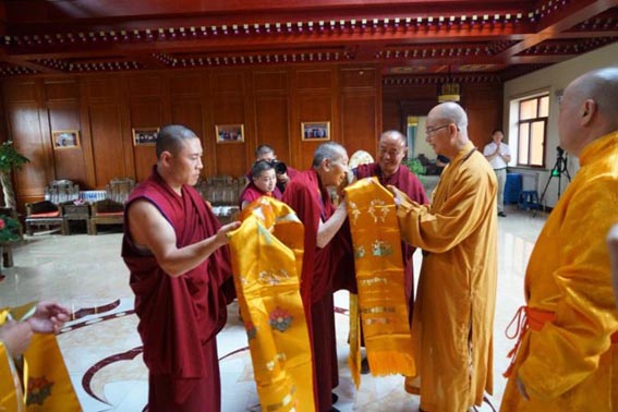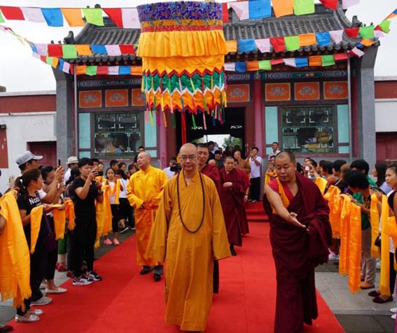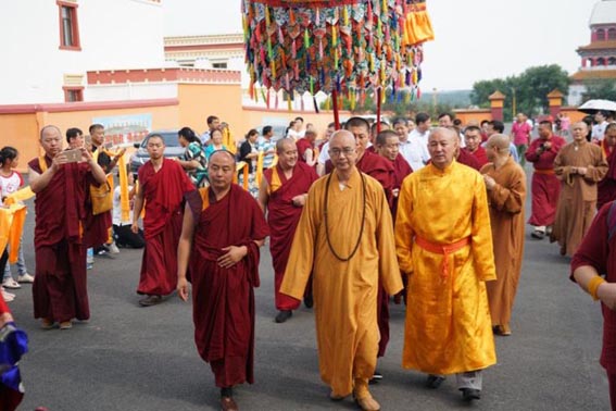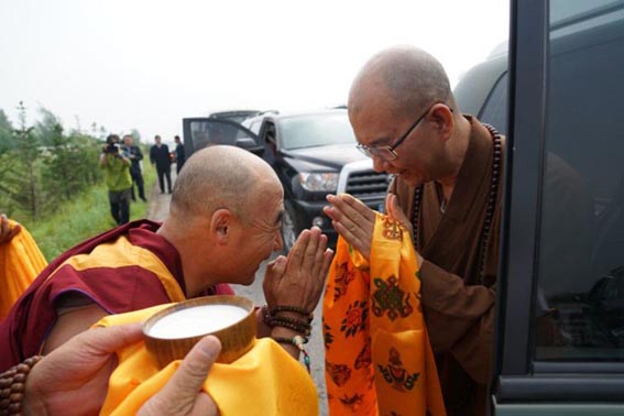 8月12日清晨,通辽市库伦旗兴源寺法幢高树、梵呗声声,僧俗二众手捧哈达盛装列队,以蒙民族、藏传佛教最高礼仪隆重迎接远道而来的中国佛教协会调研慈善代表团,住持金城驱车在高速路上中途迎接,捧着黄色的哈达上用银碗装满的鲜牛奶恭敬献给中国佛教协会会长学诚大和尚,以最纯洁之心迎接大和尚,学诚大和尚按照民族习俗,用右手指沾了洁白的牛奶到额头眉心,祝福汉蒙民族一家亲、汉藏佛教法乳一脉源远流长!