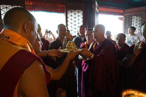 藏传僧众与学诚大和尚一起供曼扎为众生祈福,僧众用藏语诵四大部洲名字