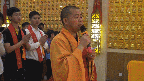 上午8时15分,贴金法会正式开始,智能大和尚带领众功德主拈香礼佛,虔诚礼拜。智能大和尚手持杨枝净水,宣说观世音菩萨水文偈:“菩萨柳头甘露水,能令一滴遍十方,腥膻垢秽尽蠲除,令此坛场悉清净。”绕场一周,洒净加持。