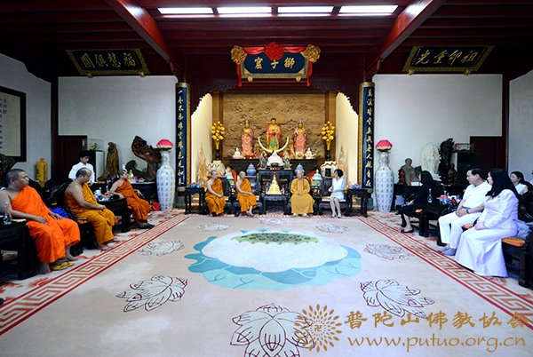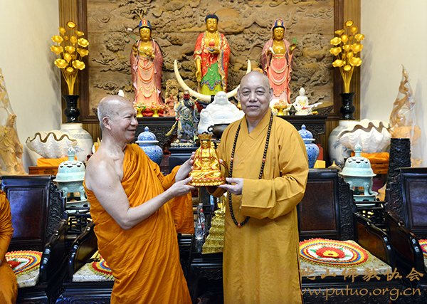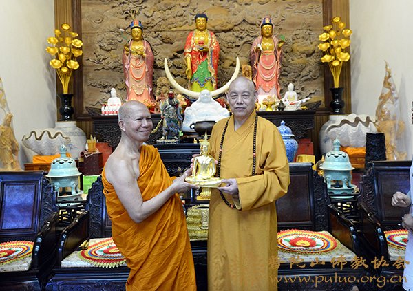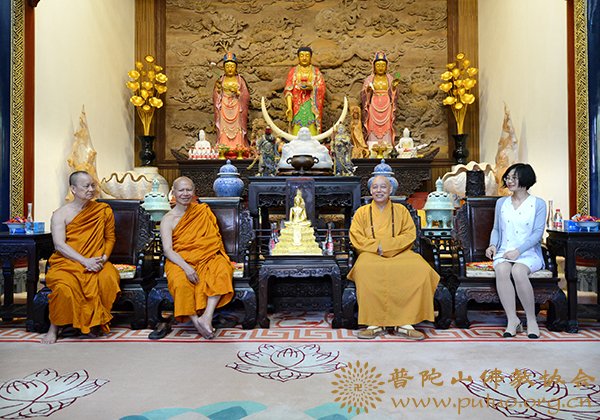 道慈大和尚对拍蓬美提长老一行来访表示欢迎,并介绍了普陀山佛教协会在寺院管理、僧才培养及对外学习交流等方面取得的成绩,并就僧才培养方面与拍蓬美提长老进行了深入交流。