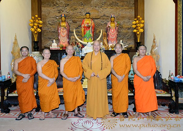 2017年8月28日上午,泰国三攀他翁寺拍蓬美提长老一行30余人到普陀山参访交流。中国佛教协会副会长、普陀山佛教协会会长、普济禅寺方丈道慈大和尚在普济禅寺方丈殿热情接待了拍蓬美提长老一行,并进行了亲切友好交谈。