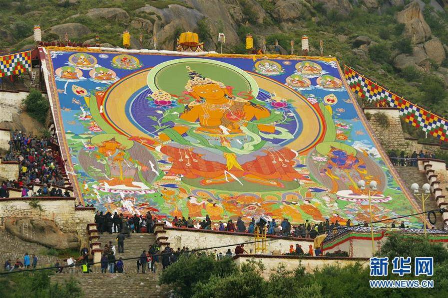 西藏拉萨哲蚌寺于2017年8月21日首次展出巨型强巴佛唐卡,吸引国内外信众、游客前来瞻仰,标志2017年拉萨雪顿节正式开幕。