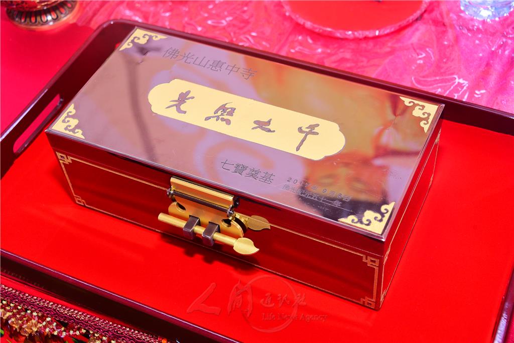 猶如一場小型珍寶入地宮的新惠中寺七寶奠基典禮,根據傳統民宅營建儀式所衍生的古禮,再賦予佛法新義,讓原本含藏濃烈信仰與文化因素的「入基儀式」,成為建寺過程中的歷史紀錄。其中珍藏七寶及經卷的寶盒,材料為不鏽鋼鍍鈦,表面鐫刻吉祥圖騰及象徵弘法大業璀璨含光的「光照大千」四字,精美堅實,結構歷久不壞。
