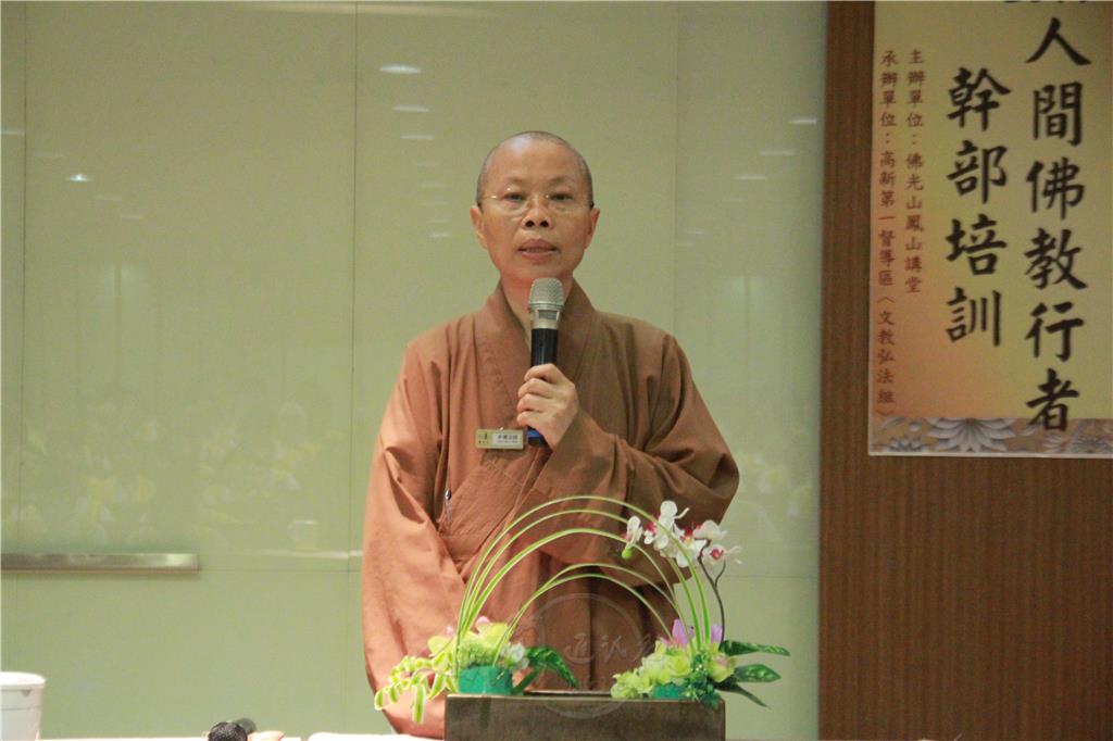 法師用淺顯的語詞詮釋人間佛教,強調護持三寶人人有責,護持三寶是人間佛教;明理悟道、犧牲奉獻是人間佛教;發菩提心、行菩薩道、無怨無悔行三好四給、五和六度是人間佛教;星雲大師是解行並重,人間佛教的實踐者,人間佛教不是口號,要口說、心明、身行。