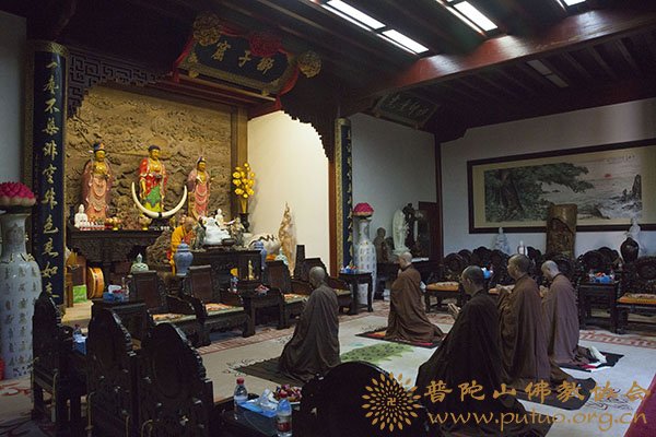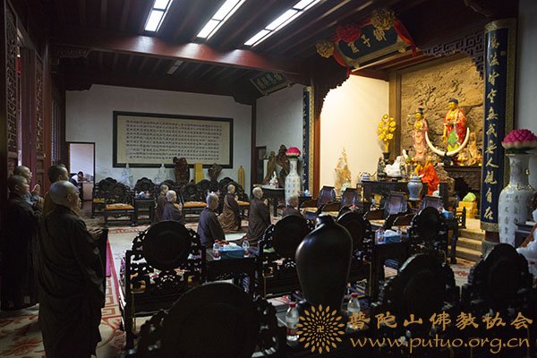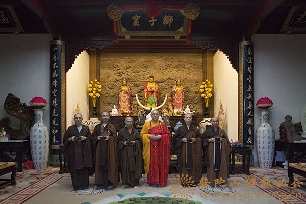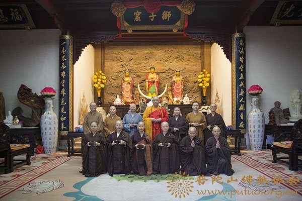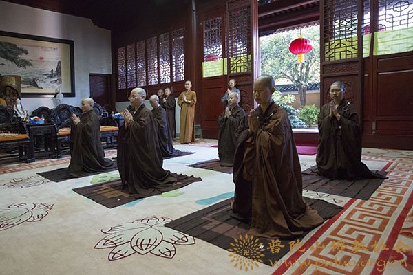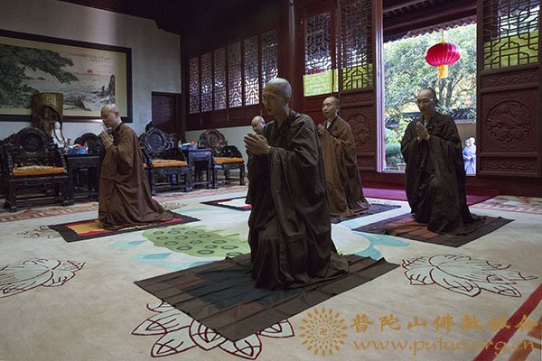 2017年9月4日(农历七月十四)上午7时,普陀山香林净院、悦岭净院、圆通禅林、梅福禅院、伴山禅院等寺院特派安居僧比丘、比丘尼前往普济禅寺方丈殿礼谢依止律师道慈大和尚,并谨遵佛制,如法举行了请教诫仪式。
