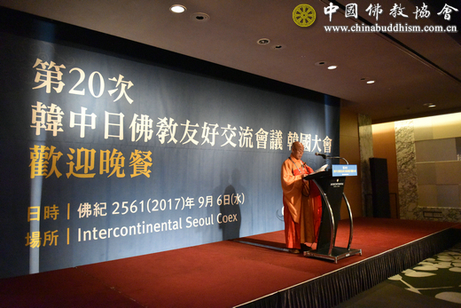 2017年9月6日至12日,由韩国佛教宗团协议会主办,以“中韩日三国佛教友好交流会议的可持续发展”为主题的第20次韩中日佛教友好交流会议在韩国首尔隆重举行。中国佛教协会组成以学诚会长为团长, 国家宗教事务局外事司副巡视员薛慧为顾问,中国佛教协会副会长明生法师为首席代表、副会长演觉法师为副团长、副秘书长普正法师为秘书长的中国佛教代表团出席此次会议,代表团由来自北京、浙江、广东、青海、新疆等10个省市的87名佛教界人士组成。
