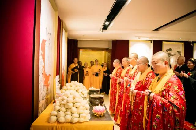 上午8时,寺内僧众及善信依仪集于觉群楼多功能厅内,一时,杨枝净水遍洒,道场清净庄严。炉香乍热,法界蒙熏,梵音齐震,心香共鸣。