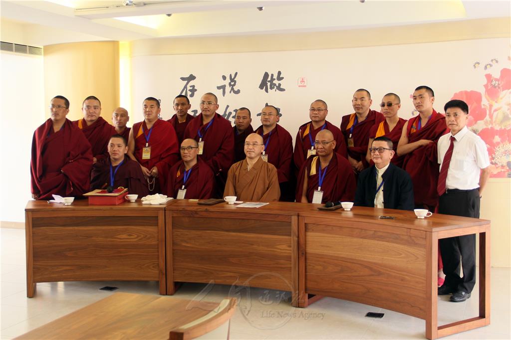 一行與佛光山寺副住持慧倫法師會面交流,土多申格首先向慧倫法師獻上哈達,雙方並互相致贈紀念品留念。