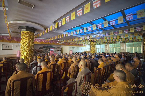 普陀山佛教协会本部法师,普济禅寺僧众、职工在大斋堂收看开幕式盛况
