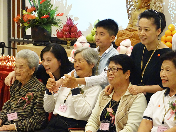 基隆地区的寿星董华英,四代温馨齐聚在法鼓山,由女儿、孙女、孙婿及曾孙等陪同前来,奉茶时家人都很感动,董华英则是面露笑容,非常欢喜,她说子女平日都在山上做义工,今天能带她来参加这个活动,特别高兴。