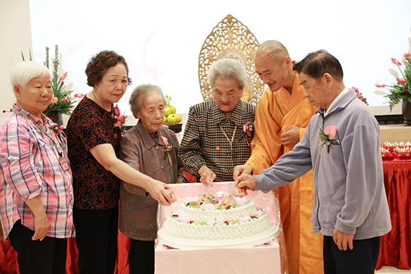 活动圆满前,法师邀请长者寿星代表共同切寿糕,并亲手逐一致赠祝福礼,为在场所有参与者,献上僧团及所有义工们满满的祝福;此次提袋和结缘礼,都是义工们配合环保理念亲手制作,期望老寿星们带着满满的幸福回忆,快乐约定明年再来互相祝寿。