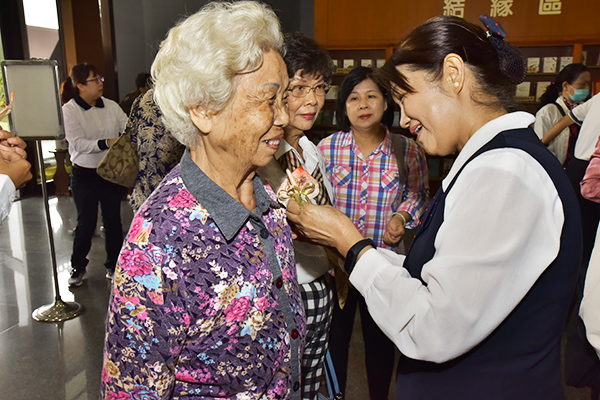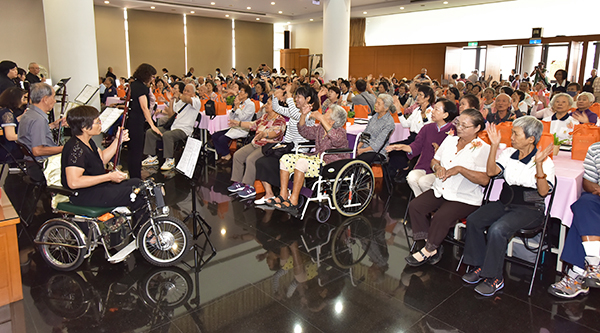 由义工逐一为长者们别上胸花後,紫云寺还贴心的提供一份感恩祝福卡,让参与的长者与家眷,能和大众彼此分享心中感谢的人事物;在满布感恩、喜悦的氛围中,大众共同聆听由法鼓山方丈和尚果东法师特地录制,带给长者的重阳节祝福,互勉「修福修慧,安心安家;六度万行,传心传家。」