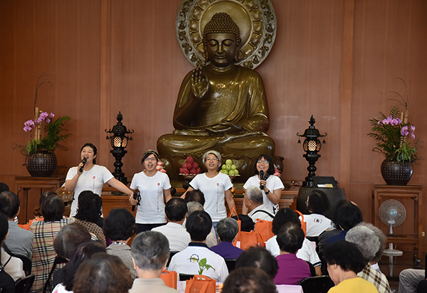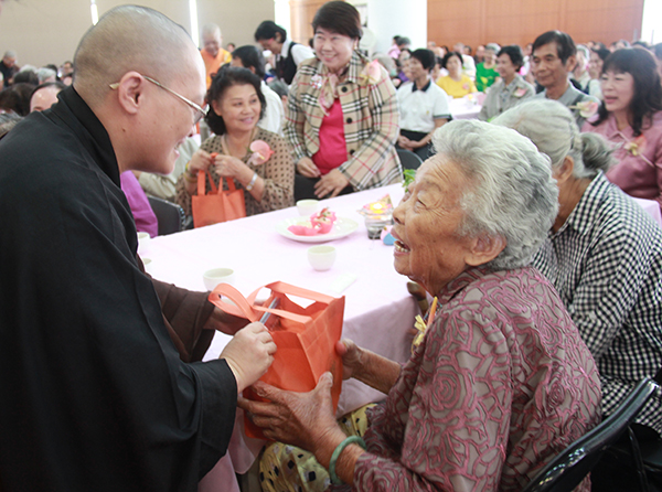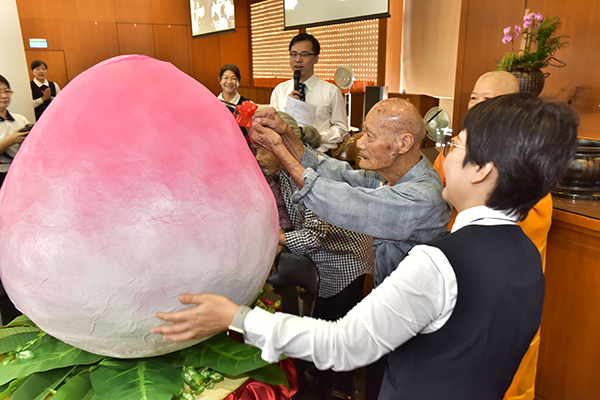 寺方并邀请高龄90岁以上的林仙花、张谢真,以及法鼓山副住持果祥法师代表全体长辈切开大寿桃。在生日快乐、我为你祝福等等愉悦的乐声中,僧团法师也逐一致赠在场的家中宝们,法鼓山为他们献上的祝福结缘礼。而随後法青的话剧、菩提乐团及手语教唱,也都令所有长辈们欢喜难忘。