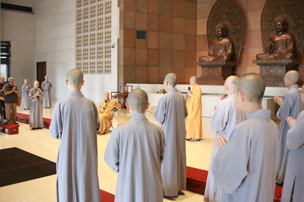 法鼓山創辦人 聖嚴法師留學日本初期的同窗淨海長老,於10/2上午10點帶領美國德州休士頓玉佛寺僧俗弟子13人,專程前訪法鼓山世界佛教教育園區。法鼓山方丈和尚果東法師、首座和尚惠敏法師,以及副住持果暉法師、果品法師等率同僧團頂禮迎接,並陪同長老參訪園區與大學院校區。