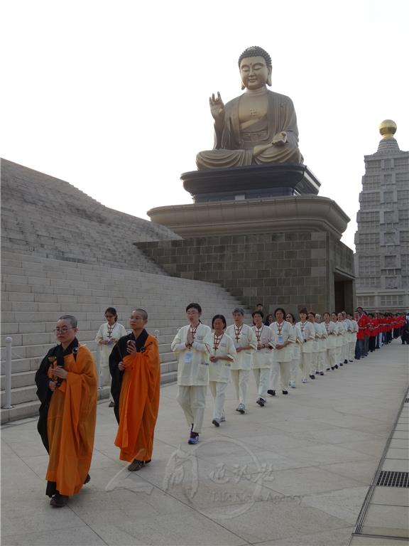 導覽結束後前往佛光樓聆聽生活說明,並至大佛平台繞塔修持,晚間「與心對話」課程,由教育推廣處滿慈法師帶領大眾以輕鬆自在、經行漫步方式,為其介紹佛館建築特色與理念,同時感受華燈初上的佛館夜景之美。