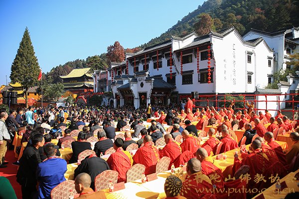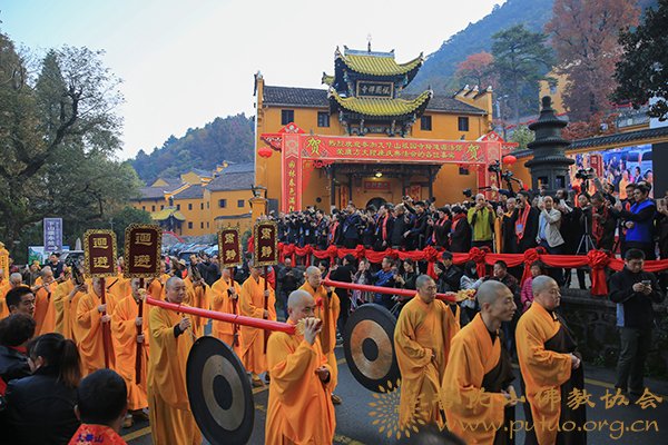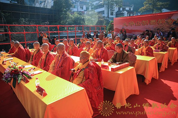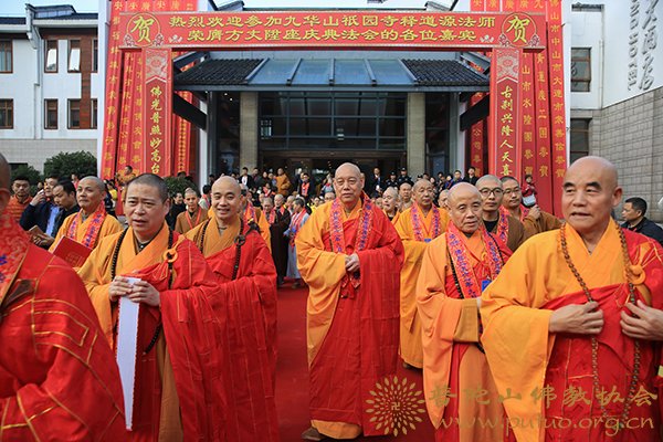2017年11月3日,金秋时节,惠风和畅,莲花佛国,人天呈祥,九华山祇园禅寺隆重举行道源大和尚荣膺方丈升座庆典法会。中国佛教协会副会长、普陀山佛教协会会长、普济禅寺方丈道慈大和尚应邀出席。各级领导,诸山长老云集福地,恭贺随喜。海内外四众弟子、护法信众、社会贤达近千人共襄盛会,同沐佛恩。