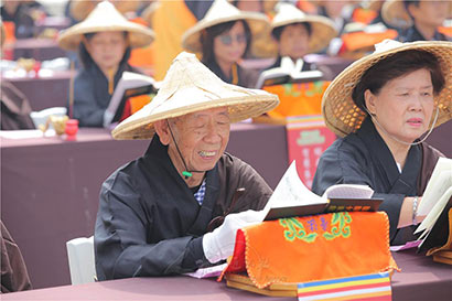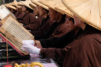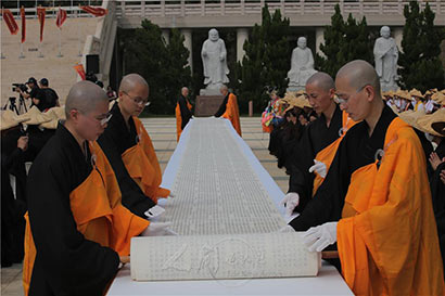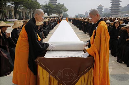 11月4日,“2017国际书展暨蔬食博览会”在台湾高雄佛陀纪念馆举行,由一千名来自世界各地的有缘人,以“千人晒经”方式揭开序幕。佛光山寺总住持心保和尚带领逾千名晒经居士发愿,祈愿生生世世护持佛法,让经典法宝永远留传。