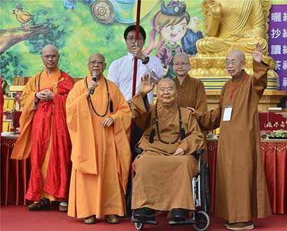 星云大师感谢大家参与千人晒经活动,赶到会场与大家见面。(图片来源:人间通讯社 摄影:庄美昭)