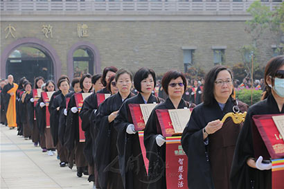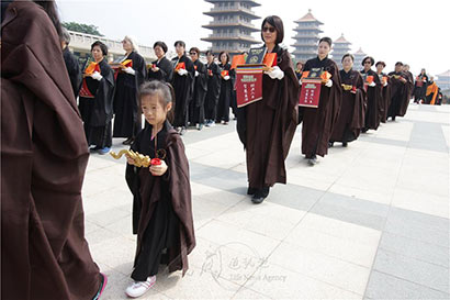 千名晒经居士在南屏敦煌舞蹈团的前导下,手捧金刚经、法华经、佛光大藏经、六祖坛经,以及星云大师“对治百法”一笔字等经典与墨宝,前往佛陀纪念馆广场启动晒经仪式。