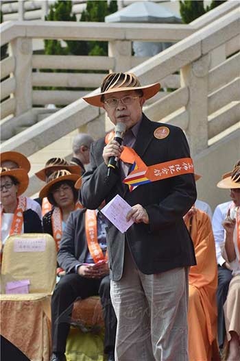 远见天下事业群创办人高希均以“星云之星,佛教之光,经典不朽,道理永存”十六个字,表达他参加“千人晒经”的悸动。(图片来源:人间通讯社 摄影:庄美昭)