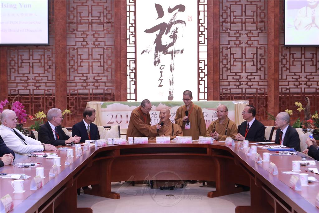 長期重視教育的佛光山系統大學創辦人星雲大師,親臨會場感謝所有與會人士,共同為佛教與教育貢獻智慧和心力。並致贈「佛」一筆字給國立東京大學名譽教授木村清孝、柏克萊加利福尼亞大學名譽教授路易斯˙蘭卡斯特及南京大學中華文化研究院院長賴永海,3人都是和大師交情逾30年的「老朋友」。