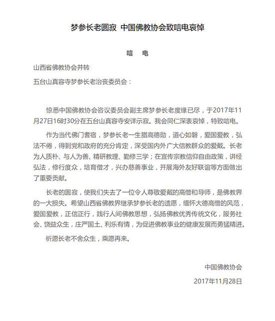 一代高僧上梦下参长老安详示寂,各界纷纷致唁电表示哀悼(汇总一)