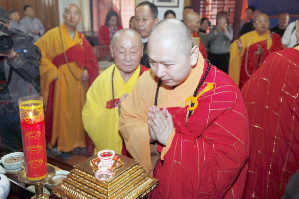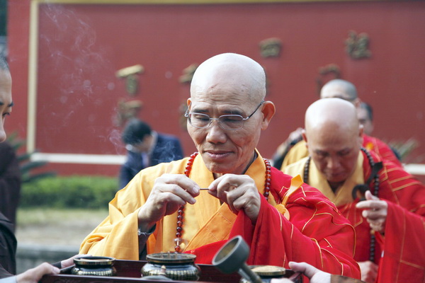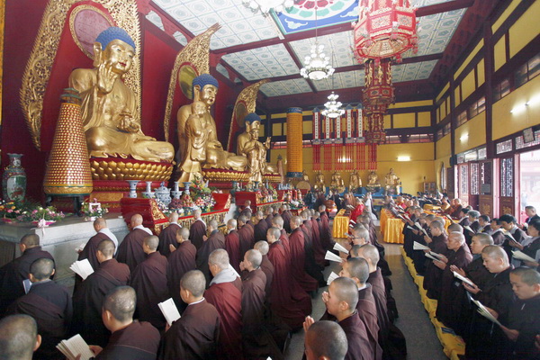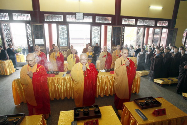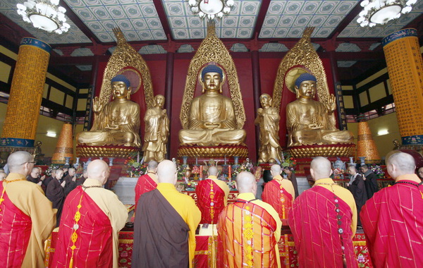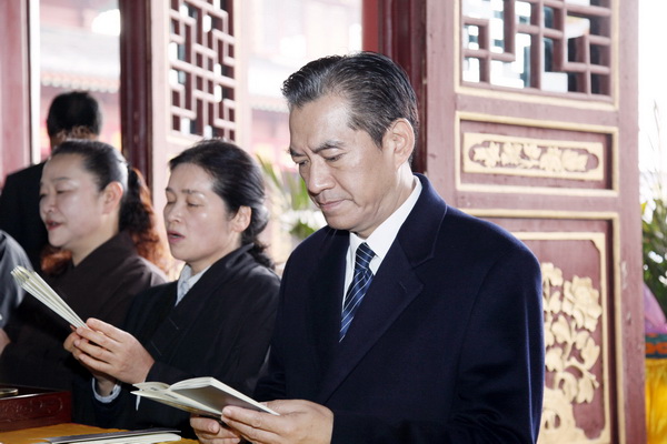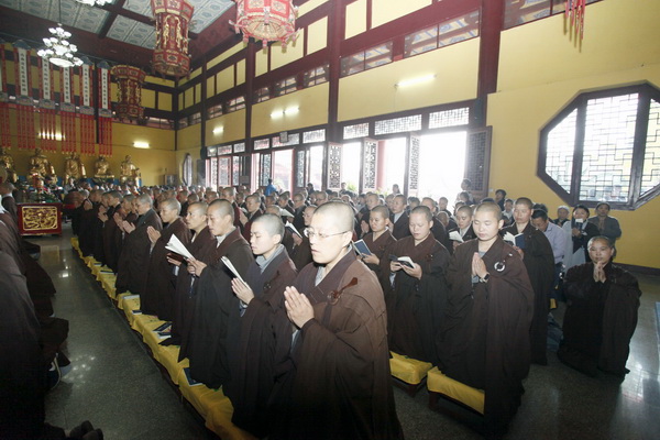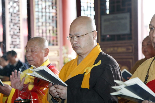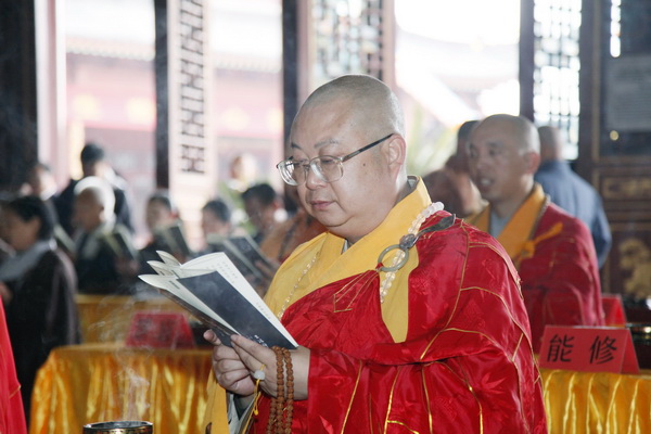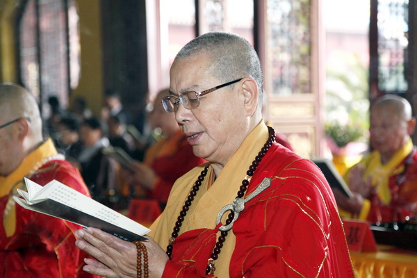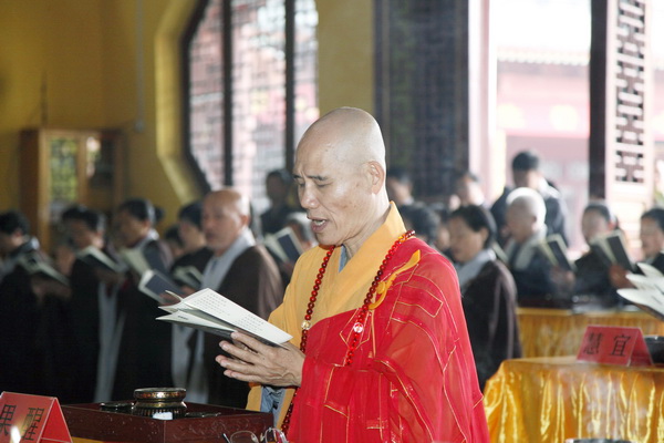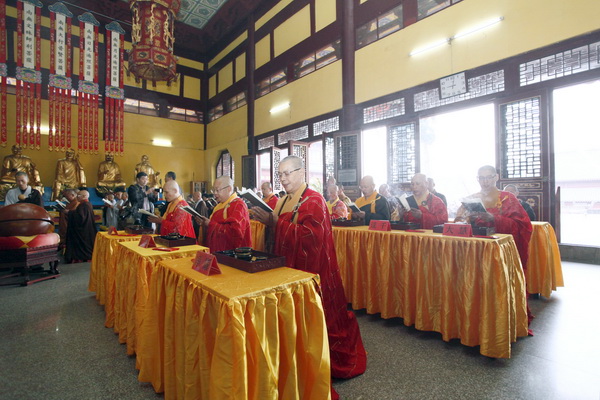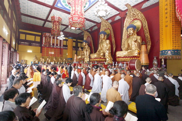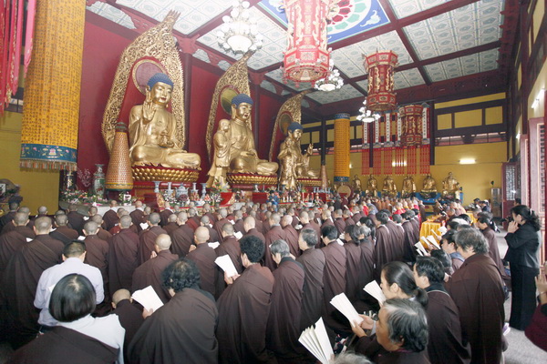 庄严隆重的祈福法会在婉转悠扬的《宝鼎赞》唱念中开始,十五位主法法师和居士信众代表依次至佛前拈香,随后大众以虔诚庄敬之心称扬圣号、礼拜《八十八佛大忏悔文》,共祈海峡两岸和平发展、人民安乐。