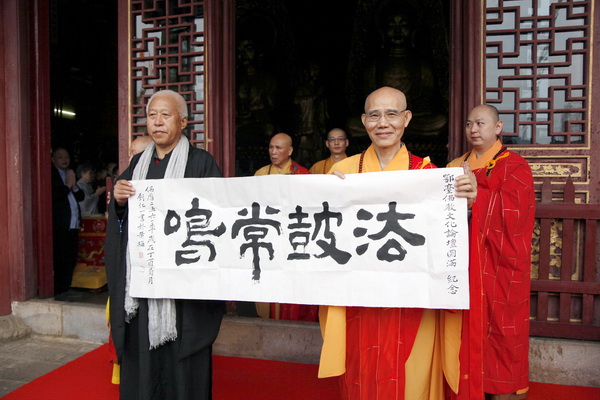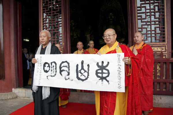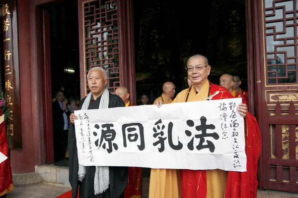 河北著名书法家刘化一先生还向台湾客人分别赠送了亲自书写的《法乳同源》和《法鼓常鸣》书法作品。
