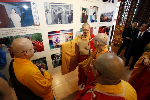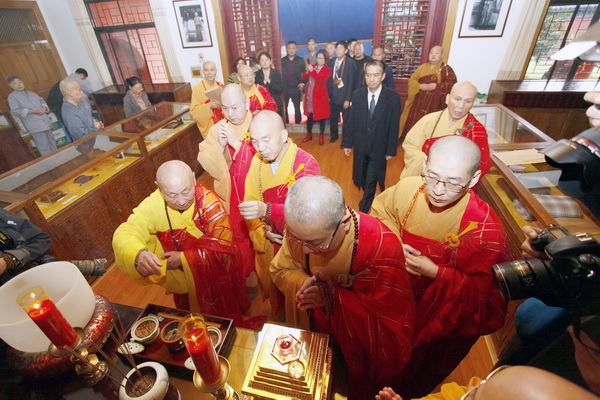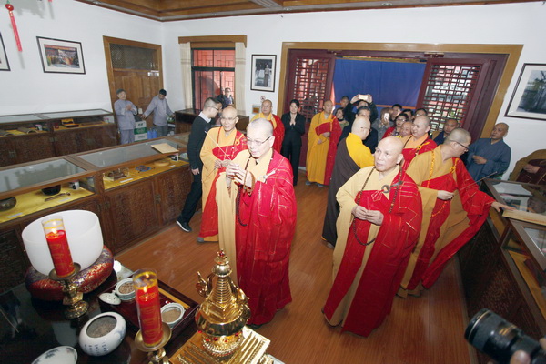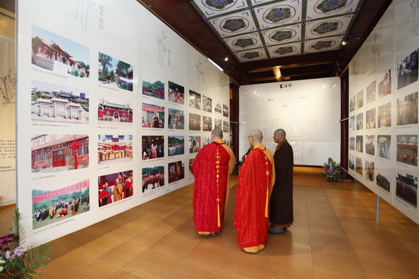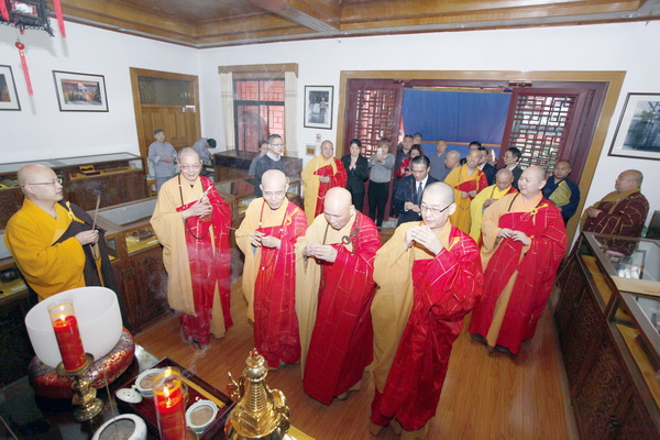 祈福法会结束后,大家还分别参观了“净慧长老在湖北”图片事迹展和净慧长老纪念堂并瞻礼长老舍利,接着大家移步会客室观看了反映净慧长老生平的纪录片。明基大和尚代表四祖寺常住向大家赠送了纪念品并在法堂前与大家合影留念。