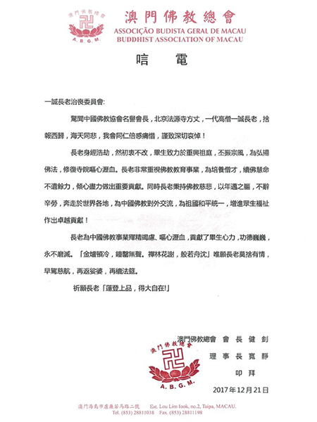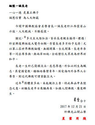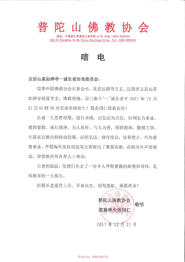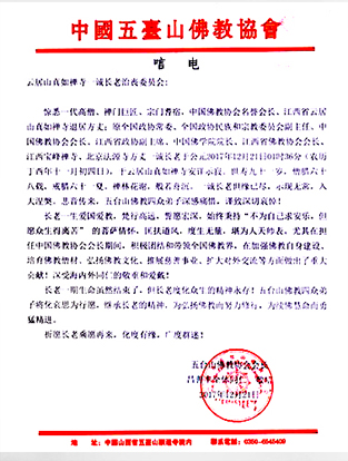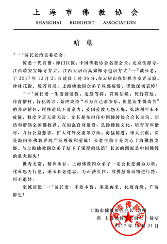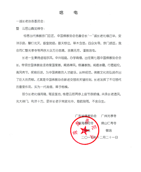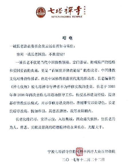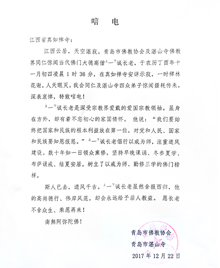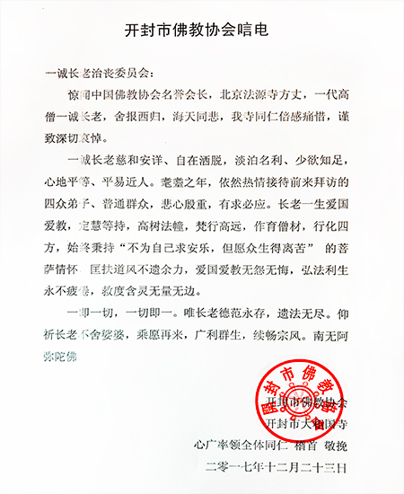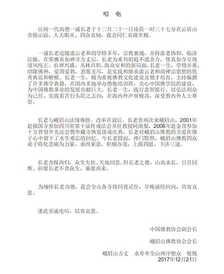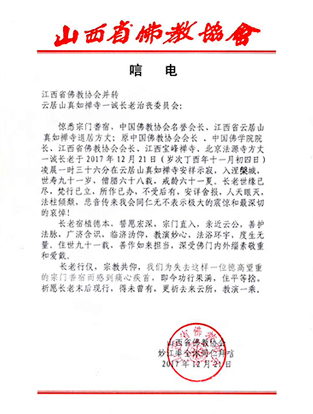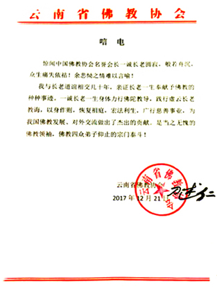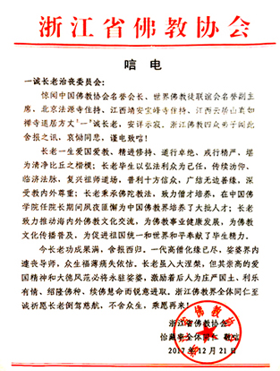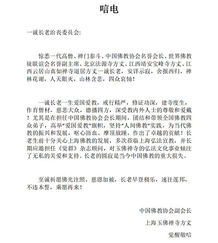 本网综合消息:一诚长老圆寂以后,社会各界及佛协组织纷纷致唁电,表达对长老年高德劭、道心如磐、持戒冰雪的崇高风范表达敬仰,对长老的舍报西归而痛惜!