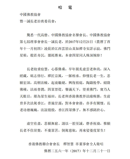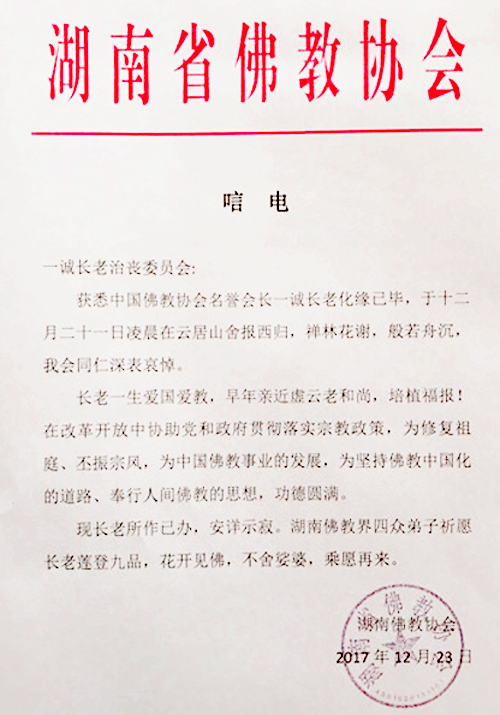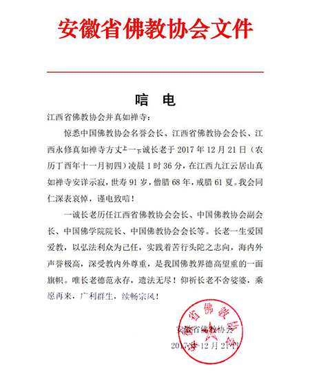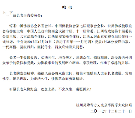 佛门泰斗一诚长老圆寂 社会各界及佛协致唁电表示哀悼