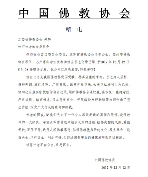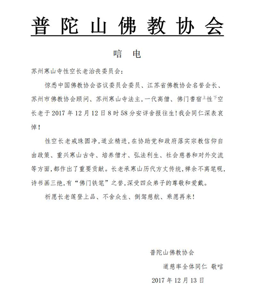 2017年12月12日(农历丁酉年十月二十五)上午8时58分,当代禅门泰斗、一代高僧性空长老于苏州寒山寺安详示寂,享寿九十七岁,僧腊82年,戒腊77夏