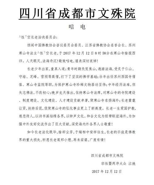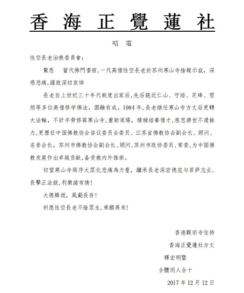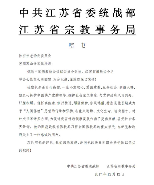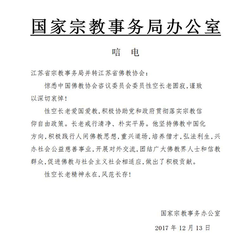 一代高僧上性下空长老安详示寂,各界纷纷致唁电表示哀悼(汇总三)