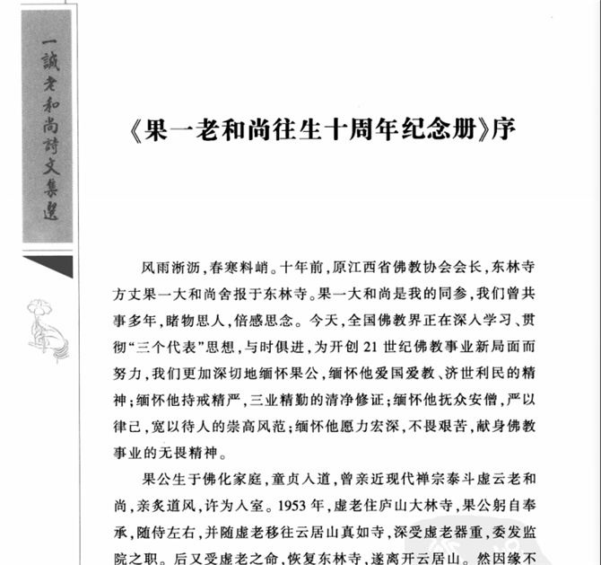 果一上人圆寂十周年之际,长老还亲自为东林寺编辑的《果公上人往生十周年纪念册》作序,并深情缅怀道:“果一大和尚是我的同参,我们曾共事多年,睹物思人,倍感思念。”
