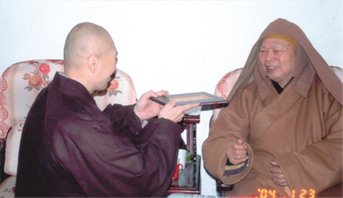 大安法师奉上聘书,诚请一诚长老(右)为东林大佛顾问