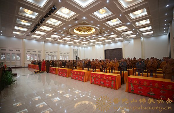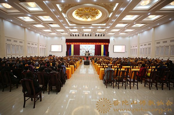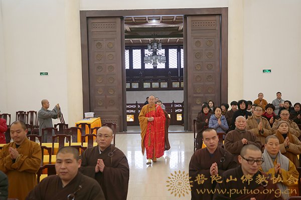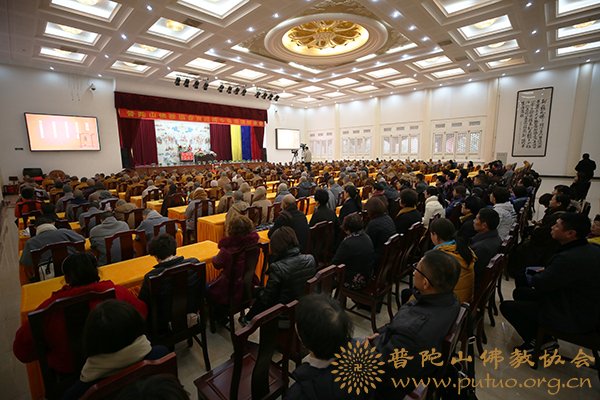 2017年12月16日下午,浙江省佛教协会副秘书长、舟山市佛教协会会长、普陀山佛教协会副会长、普陀山隐秀讲院监院净旻法师应邀于宝陀讲寺普门讲堂作了题目为《<金光明经>讲要》的佛学专题讲座,佛协弘法办主任寂戒法师、副主任修定法师等出席,来自全山各寺院的僧众、中国佛学院普陀山学院学生和随喜居士共300余人参加讲经法会。