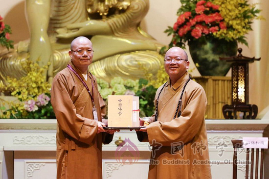 理证法师向佛光山住持心保法师赠送礼品——我院院刊《中国佛学》