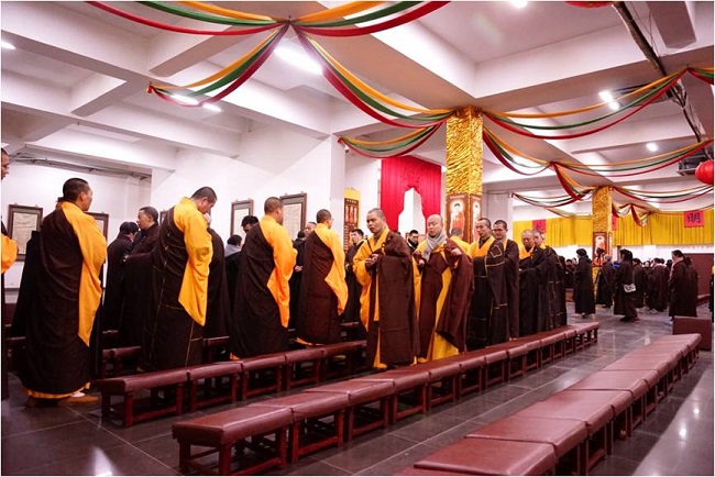 12月7日下午三点半,在大雄宝殿,东林寺诸位法师同菩提寺常住师父和居士一道进行洒净熏坛,由当家师圣如法师主法,以期龙天护佑、法会圆满。