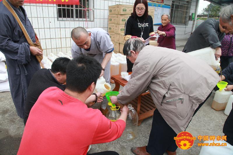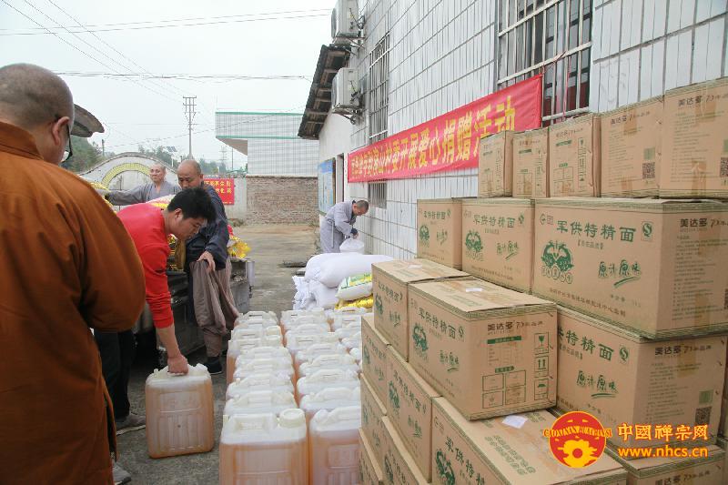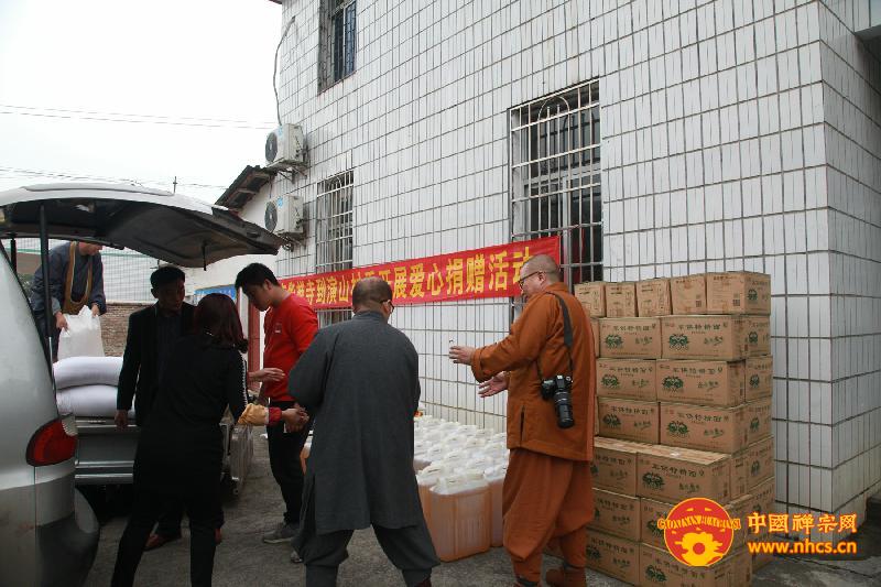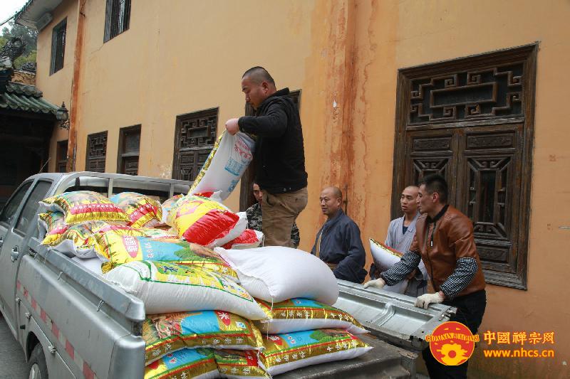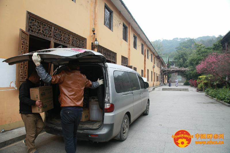 受传正大和尚委托,午饭过后,法强法师、照定法师、妙理法师及果玉法师等几位法师便赶往库房与义工一同装车,趁午休时间将米、面、油等捐助物资送往曲江区演山村。